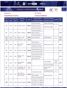 El día 1 arranca el 16 de diciembre a las 9:00 a.m en la Municipalidad de Heredia con rumbo a Nicoya, involucrando un recorrido de 165 km, y el día 10 cómo ha sido usual en los últimos años, concluirá el 25 de diciembre en la Aurora de Heredia con la etapa Circuito Presidente (100 km), iniciando a las 10:00 a.m.