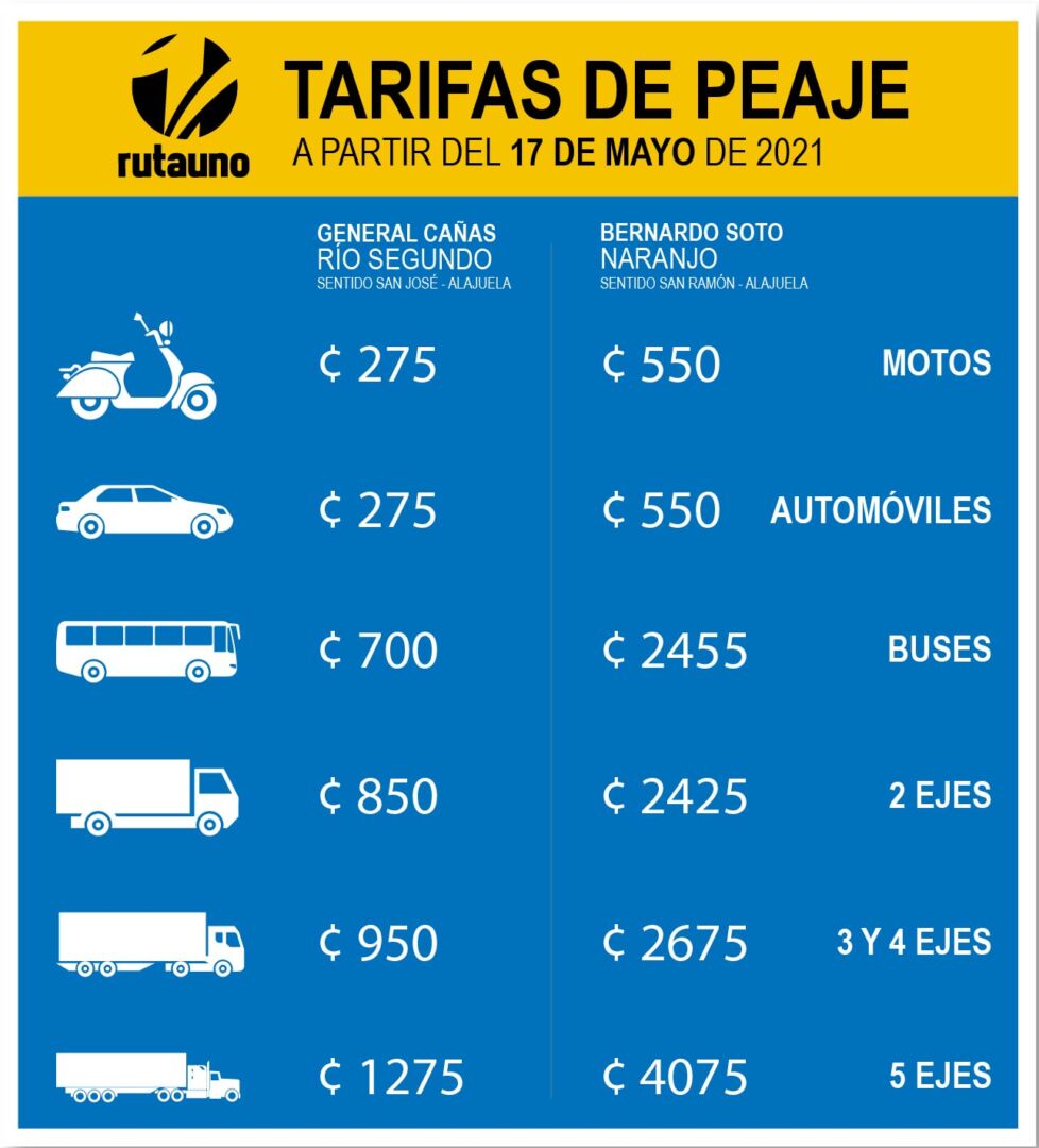 De acuerdo con los cálculos realizados por el Fideicomiso Ruta Uno, con base en la metodología aprobada para el ajuste de las tasas de peaje, en la estación de Naranjo (carretera Bernardo Soto) las personas usuarias de todas las categorías de vehículos percibirán variaciones entre ₡25 y ₡100 y, para el caso de la estación de peaje de Río Segundo (carretera General Cañas), las categorías de buses y camiones tendrán una variación entre ₡25 y ₡50, mientras que los vehículos livianos y motocicletas mantendrán las tarifas vigentes, tal como se muestra en el siguiente recuadro: