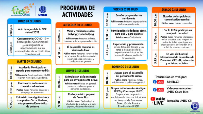 ¿Le gustaría conocer qué hacen las comunidades con el apoyo de la UNED? No se pierda la Feria Institucional de Extensión (FIEX) virtual 2021, que del 28 de junio al 4 de julio exhibirá más de 40 experiencias comunitarias de extensión y proyección social, con una agenda de charlas y presentaciones artísticas gratuitas para toda la población.