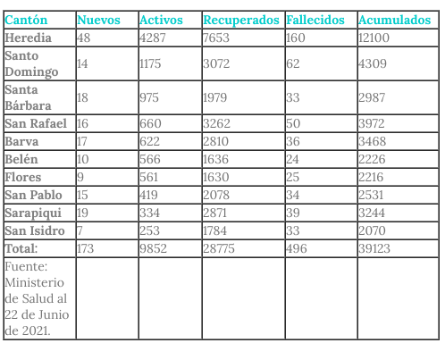 Al 22 de junio, la provincia de Heredia registra 39 123 casos acumulados COVID-19, de estos 28 775 personas lograron vencer la situación, es decir, poco más del 73%.
