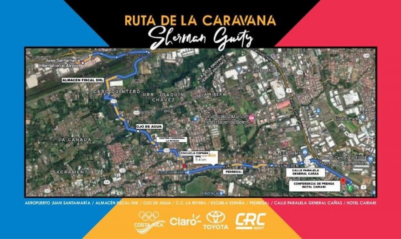 Según informó el Comité Olímpico Nacional, la caravana de este jueves 9 de septiembre iniciará desde el aeropuerto Juan Santamaría a las 6:00 de la tarde, el recorrido llevará a Guity a pasar por sitios como Ojo de Agua, San Antonio de Belén y Hotel Cariari, lugar donde ofrecerá una conferencia de prensa.