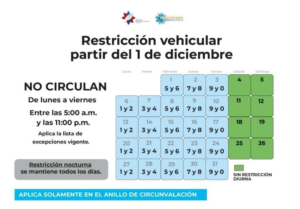 Durante el mes de diciembre la restricción vehicular funcionará de la misma manera que funcionó durante noviembre: