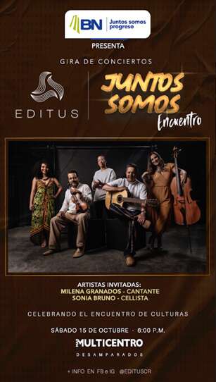 Ell 18 de septiembre anterior dio inicio la gira “Juntos somos” un concepto artístico en el cual Éditus y el Banco Nacional están haciendo un recorrido por diversas localidades para presentarle al público el repertorio que ha distinguido internacionalmente al trío compuesto por Ricardo Ramírez, Edín Solís y Carlos “Tapado” Vargas, acompañados por una cellista y por diferentes cantantes.