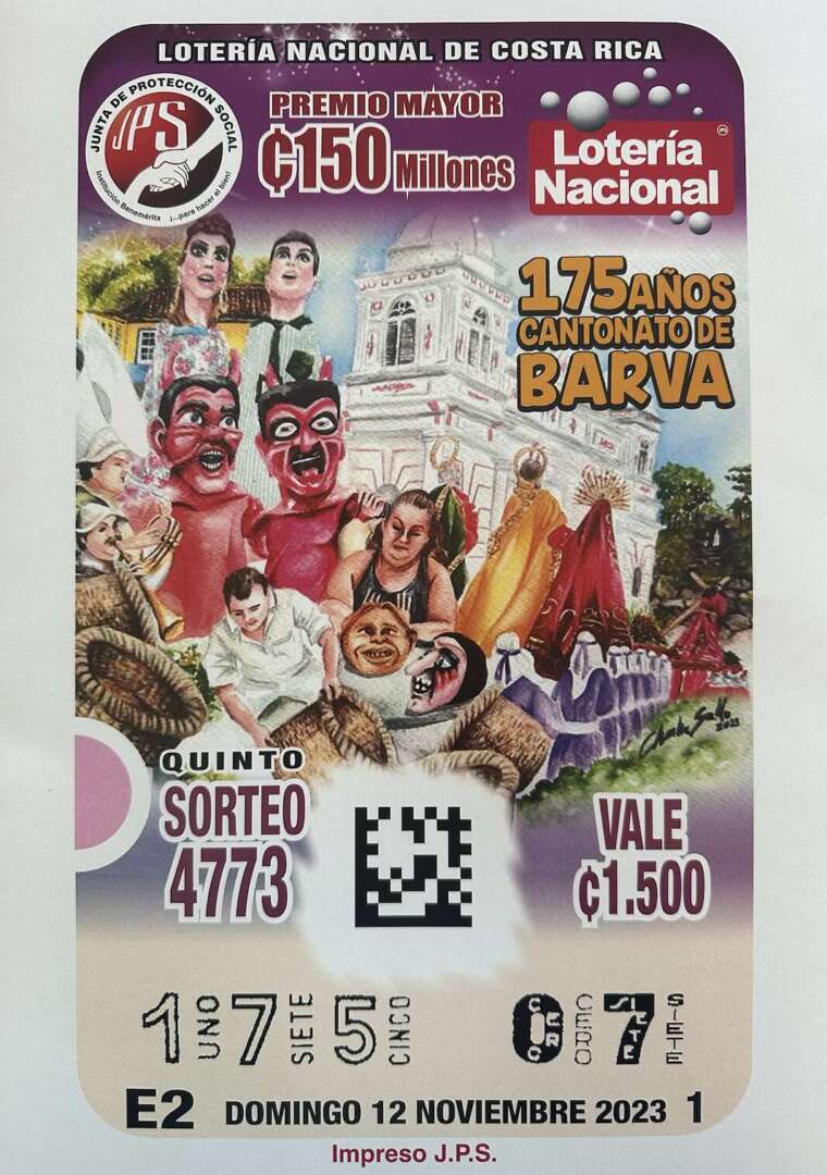 Un billete de lotería retrata la identidad y belleza del cantón de Barva. Se trata de una emisión de la lotería nacional en conmemoración de su 175 cantonato, cuyo sorteo se realizará el próximo domingo 12 de noviembre.