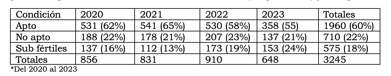Del 2020 al 2023 se han evaluado más de 3245 toros en todo el país.La andrología bovina estudia la fertilidad del toro reproductor