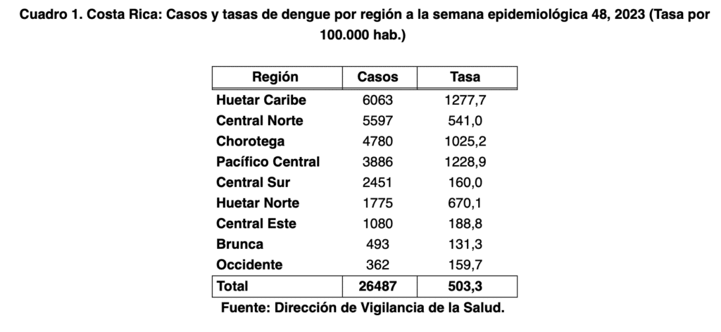 Las regiones con mayor cantidad de casos de dengue registrados durante este año son; región Huetar Caribe con 6.063 casos, seguido de la Central Norte con 5.597 casos y la Chorotega con 4.780 casos.
