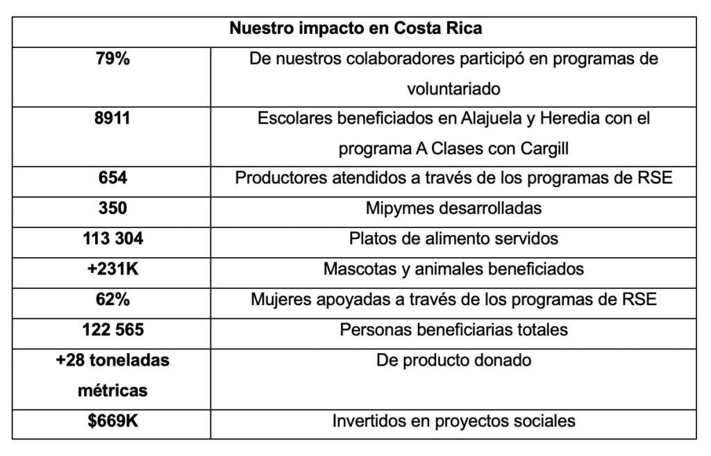 Cabe destacar que los colaboradores de Cargill son el corazón detrás de todas las acciones. Durante el 2022-2023, con valentía y dedicación todos los colaboradores en la región han contribuido con más de 23, 000 horas de servicio voluntario, multiplicando el aporte que realiza la compañía al beneficiar a más de 993,000 personas y entregado más de 232 toneladas de productos donados. Esto se logra a través de los distintos programas en Centroamérica, entre ellos “Nutriendo el Futuro” en alianza con CARE, “Productores y merienda escolar” con el Programa Mundial de Alimentos, “Comunidades Sostenibles” con Glasswing, “Prosperando con nuestros clientes” con FUNDES y “Dejando Huella” de Bienestar Animal, entre otros.