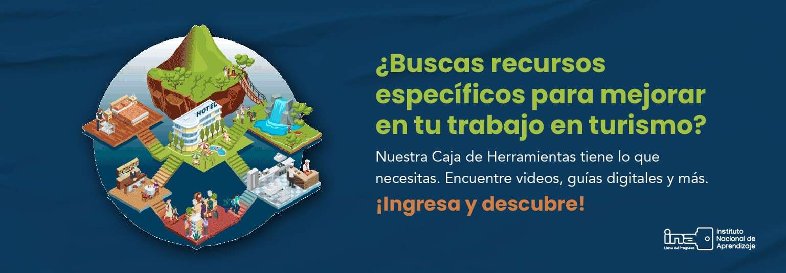 La caja de herramientas es un sitio web desarrollado por el Núcleo de Turismo y la Unidad de Servicios Virtuales del INA que responde a un esfuerzo conjunto con la Cámara Nacional de Turismo para ofrecer contenidos gratuitos que potencien la empleabilidad.