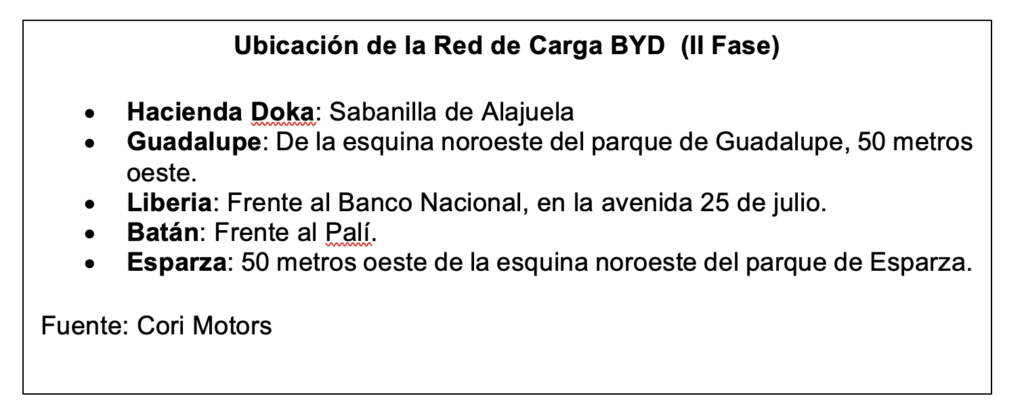 La realización del BYD Experience sirvió de marco para que Cori Motors anunciara el lanzamiento de la segunda fase de la red de carga de BYD con 17 nuevos cargadores ubicados en zonas estratégicas del país. (ver cuadro ubicación).