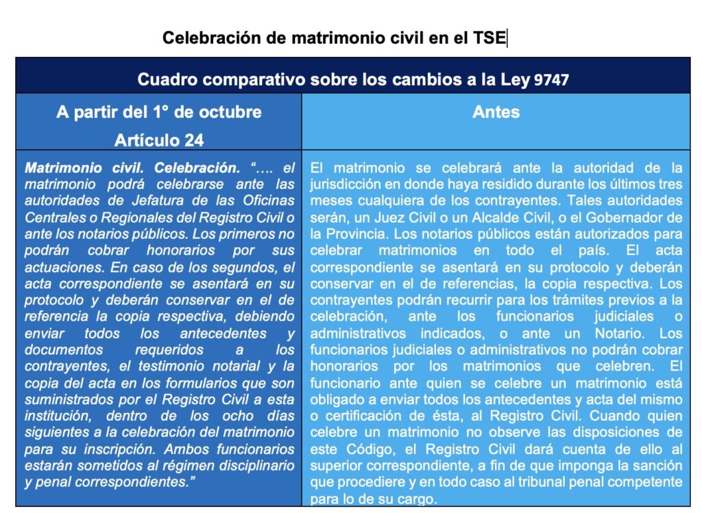 A partir del 1° de octubre, el Tribunal Supremo de Elecciones (TSE) podrá celebrar -de manera gratuita- matrimonios, homologar acuerdos de separaciones y divorcios, así como tramitar reconocimientos de hijos nacidos fuera del matrimonio, a raíz de la entrada en vigencia de la ley n.° 9747, denominada Código Procesal de Familia.