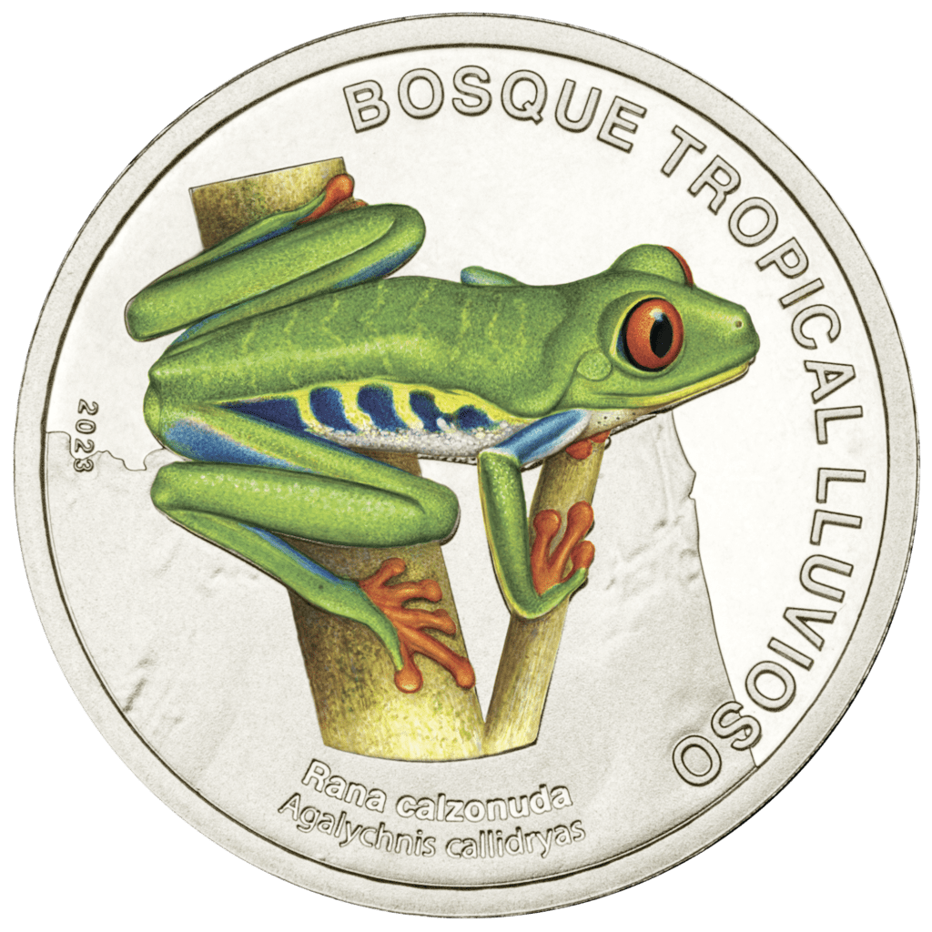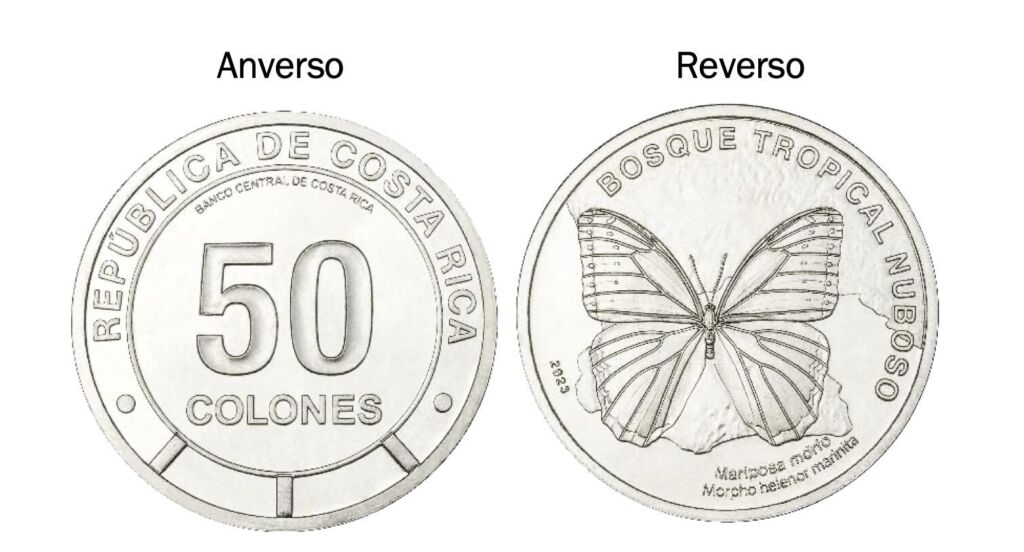 “En el reverso se destaca el nombre de cada uno de los ecosistemas de Costa Rica. Para la primera moneda que se pondrá en circulación se podrá leer «Bosque tropical nuboso» y los nombres común y científico «Mariposa morfo» y «Morpho helenor marinita». En el diseño también se observa una proporción del mapa del bosque tropical nuboso, y el numeral «2023» correspondiente al año de aprobación del diseño por parte de la Junta Directiva del Banco Central de Costa Rica».