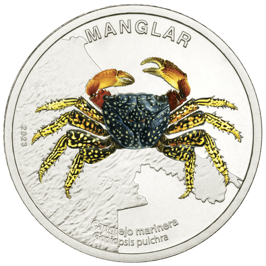 La nueva colección, denominada “Fauna de los ecosistemas”, consta de seis piezas para presentar especies de nuestra biodiversidad: la mariposa morfo (bosque tropical nuboso), la rana calzonuda (bosque tropical lluvioso), la tortuga carey (arrecife coralino), la lagartija o anolis (bosque tropical seco), el cangrejo marinera (manglar) y el conejo de monte (páramo).