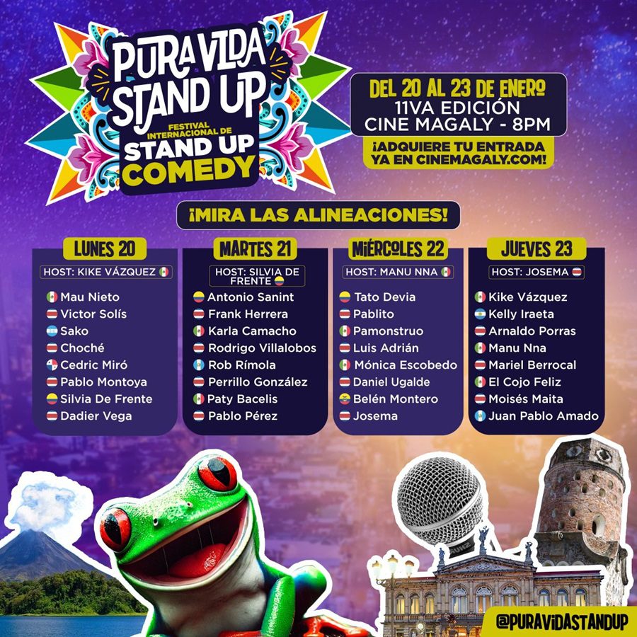 El evento más esperado por los amantes de la comedia en Latinoamérica está a punto de comenzar. Se trata de la onceava edición del Festival Internacional de Stand-Up Comedy, el cual se llevará a cabo del 20 al 23 de enero de 2025 en las instalaciones del Cine Magaly, ubicado en Barrio La California, San José.