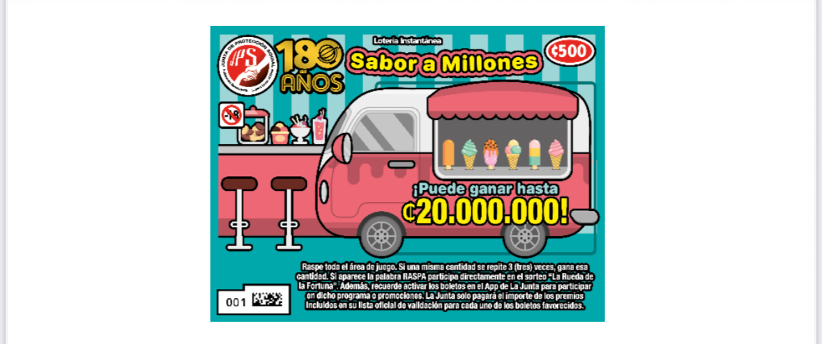 “Este juego trae consigo un gran premio de 20 millones de colones, además de muchos otros premios memorables que te ayudarán a cumplir tus sueños. Con “Sabor a Millones” puede ganar premios al instante al raspar el área de juego y si una misma cantidad se repite 3 (tres) veces, gana esa cantidad. Y eso no es todo: los boletos no premiados te dan la oportunidad de participar en los concursos del programa Rueda de la Fortuna», puntualizó el comunicado de prensa.